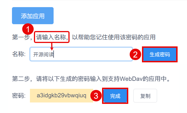 - WebDav 密码:(刚刚生成的应用密码)